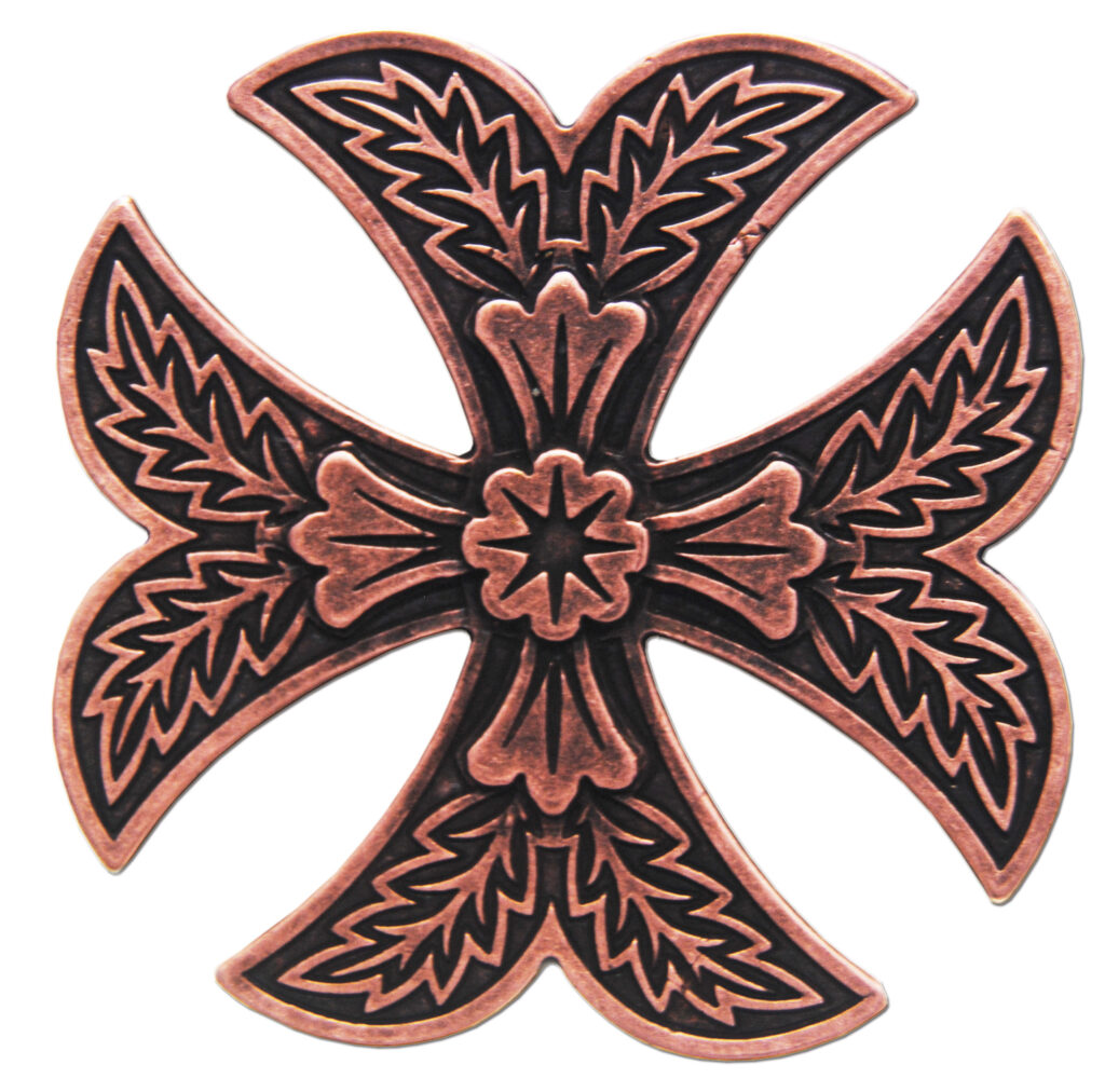 La cruz está tomada de la estatua yacente de san Millán, en el cenotafio del monasterio de Suso. Es una excepcional obra románica del siglo XII. El santo está revestido de pontifical y lleva la cruz en la casulla.
